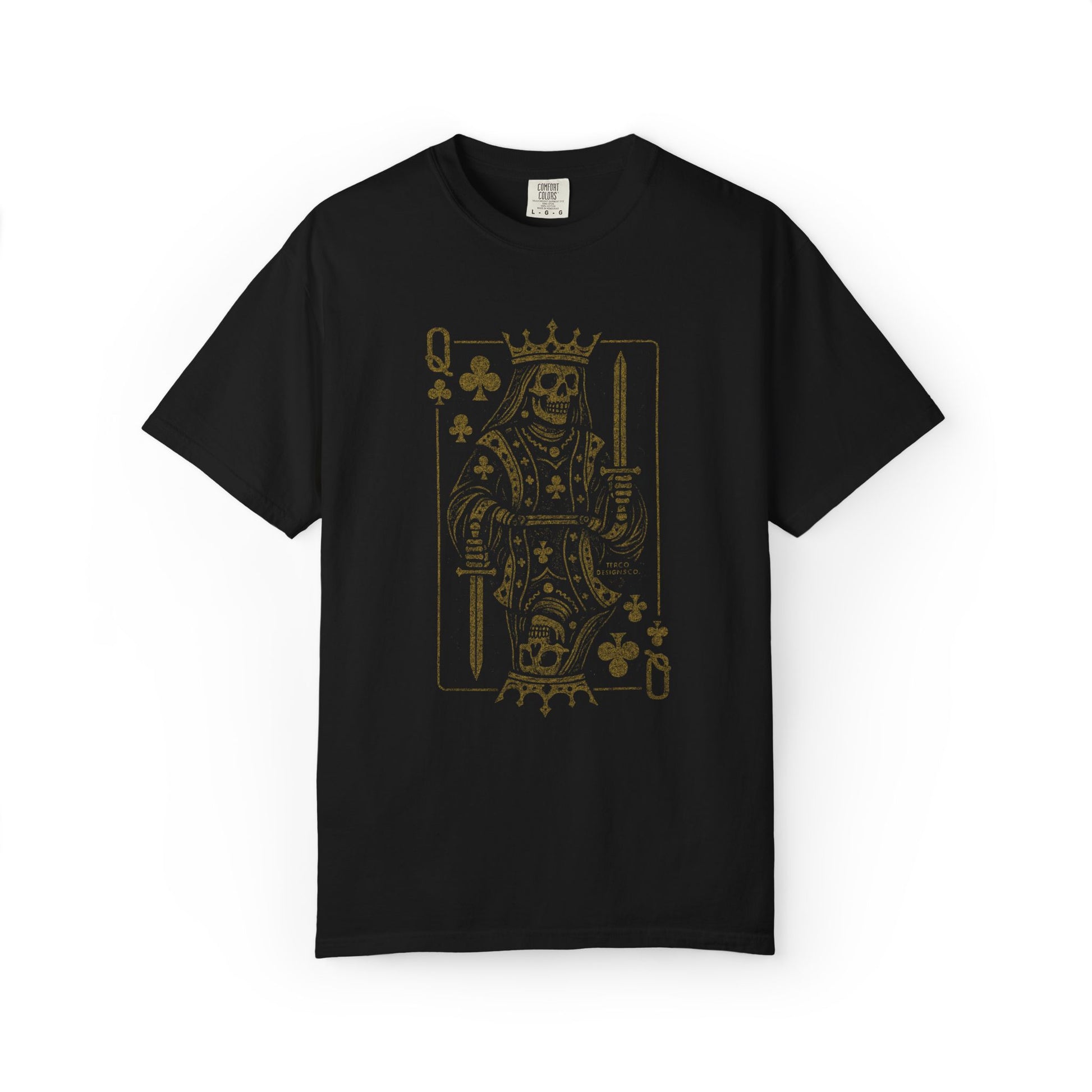 Dark royalty reigns supreme in The Bone Queen by Terco Design Co. This skeletal queen of clubs grips her sword with regal menace, blending gothic edge with playing card elegance. A haunting twist on a timeless symbol of power.
